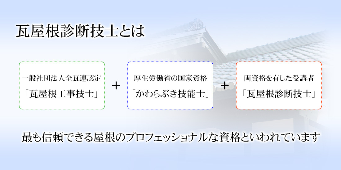 瓦屋根診断技士とは、一般社団法人全瓦連認定「瓦屋根工事技士」及び、職業能力開発促進法に基づく厚生労働省の国家資格「かわらぶき技能士」の両資格を保有し、屋根の診断を適性かつ誠実に行うことができると証される者です。