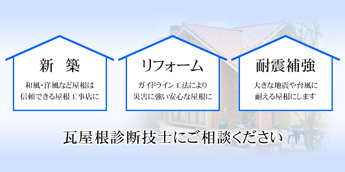 屋根の新築・リフォーム・修理・点検など、愛知県の屋根工事プロ『瓦屋根診断技士』へご相談ください。