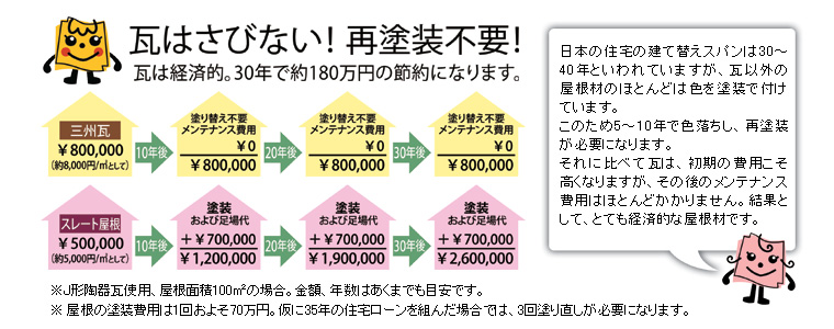 屋根には、耐風、耐震、耐雪などの他に、耐久、耐湿、耐水など、多くの機能が長期間にわたって求められます。これらを総合した上で、はじめて高いか安いかが判断できます。そういう意味では、瓦は最も経済性にすぐれた屋根材といえます。セールスマンの説明は、おそらく最初の工事費(いわゆるイニシャル・コスト)だけの比較によるものと考えられますので、もっともらしい数字が並べられてあっても、正確な比較とはいえません。「安物買いの銭失い」だけは避けて下さい。